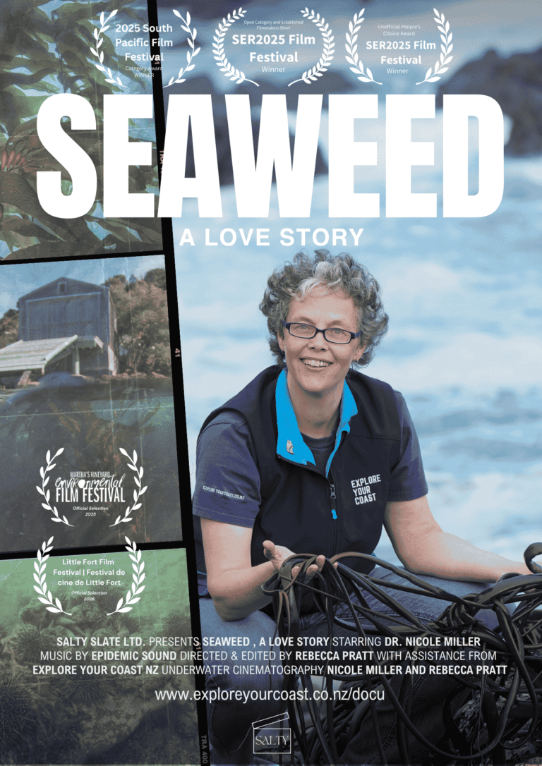 The award-winning documentary highlights the work of Explore Your Coast Founder, diver and seaweed enthusiast Nicole Miller as she documents Wellington’s coastline and brings the beauty of seaweed to the surface. This short documentary by Salty Slate Ltd invites you to dive into the amazing seaweed forests of New Zealand’s capital city – Te Whanganui-a-Tara, Wellington. Watch the trailer here on YouTube.